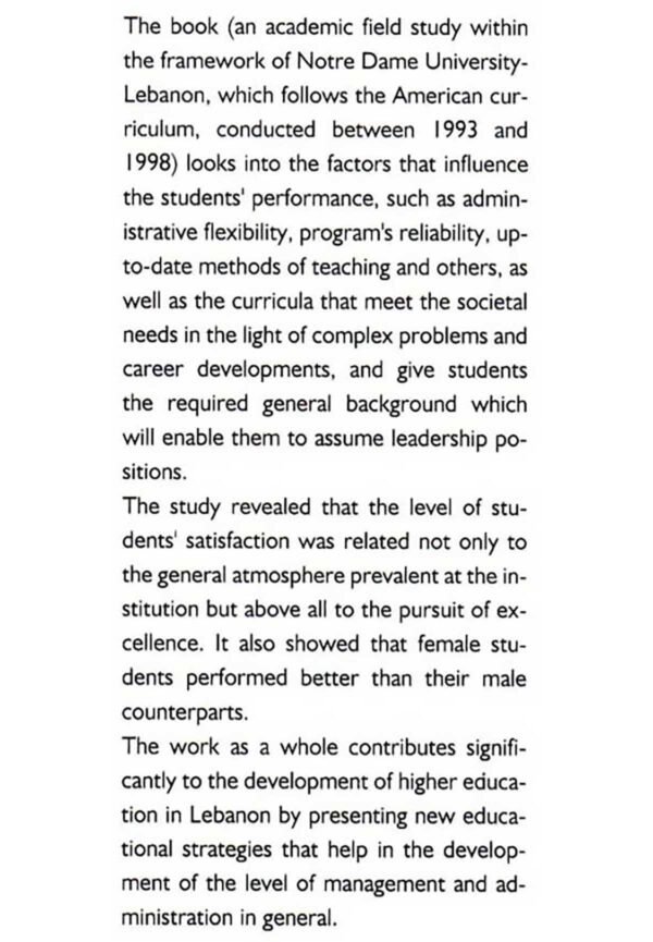 The book (an academic field study withing the framework of Notre Dame University-Lebanon, which follows the American curriculum, conducted between 1993 and 1998) looks into the factors that influence the student’s performance, such as administrative flexibility, program’s reliability, up-to-date methods of teaching and others, as well as the curricula that meet the societal needs in the light of complex problems and career developments, and give students the required general background which will enable them to assume leadership positions.